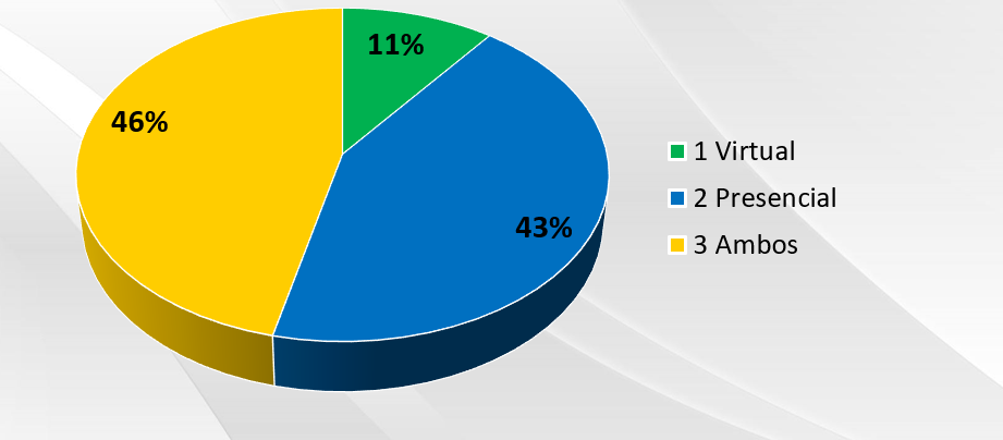 Dos CFCs entrevistados, 46% utilizam ambas modalidades (virtual e presencial), 43% somente a presencial e 11% a virtual.
